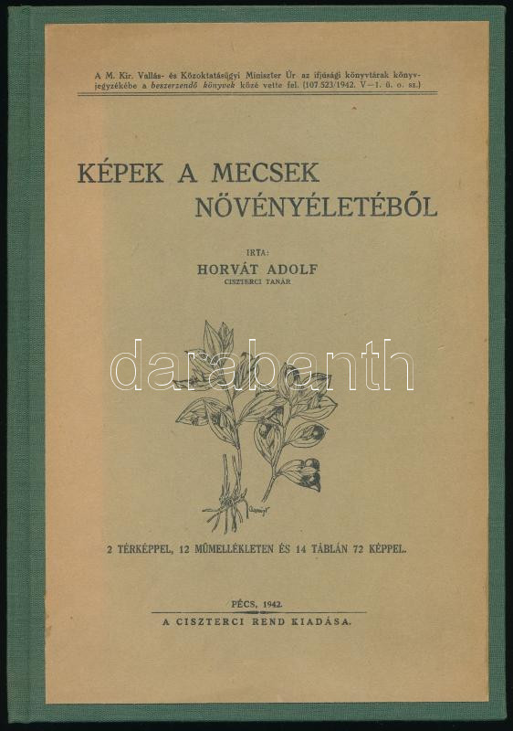 Horvát Rudolf: Képek a Mecsek növényéletéből. Pécs, 1942, Ciszterci Rend. 103p. Újrakötött egészvászon kötés, ráragasztva az eredeti borító, jó állapotban.