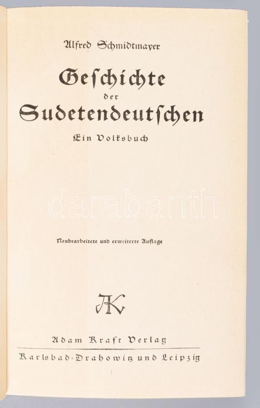 (A szudétanémetek története) Alfred Schmidtmayer: Geschichte der Sudetendeutschen: ein Volksbuch Adam Kraft Verlag, 1941. Kiadói kartonálásban, papír védőborítóval