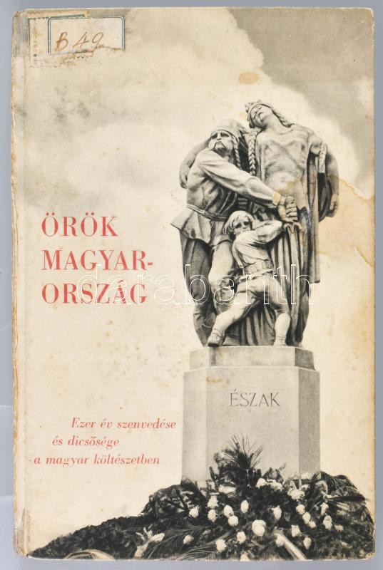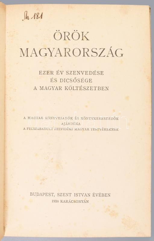 Örök Magyarország. Ezer év szenvedése és dicsősége a magyar költészetben. A Magyar Könyvkiadók és Könyvkereskedők ajándéka a felszabadult felvidéki magyar testvéreknek. Bp., 1938, Magyar Könyvkiadók és Könyvkereskedők Országos Egyesülete, 61+3 p. Kiadói kartonált papírkötés, kopott, foltos borítóval, a gerincen kis javítással, régi intézményi bélyegzéssel.