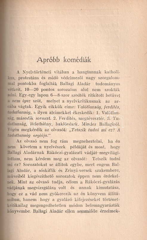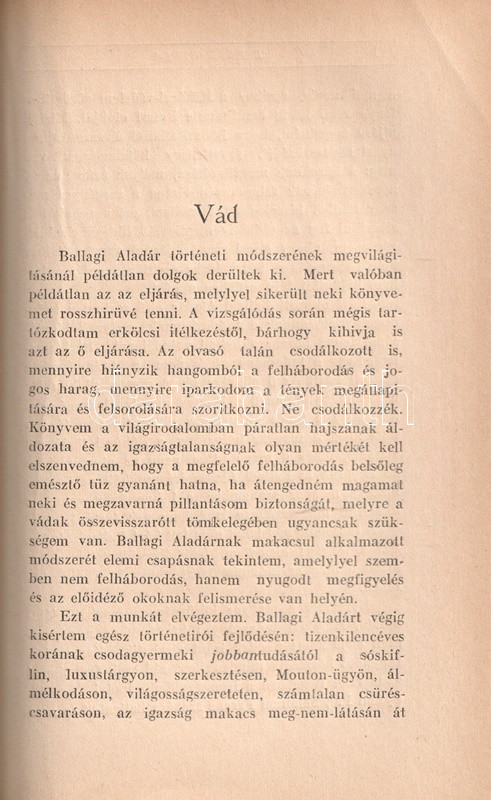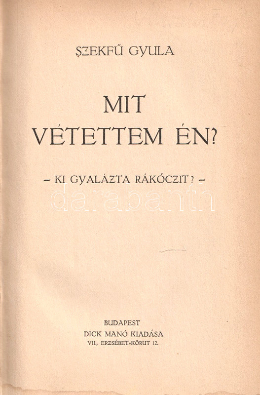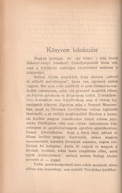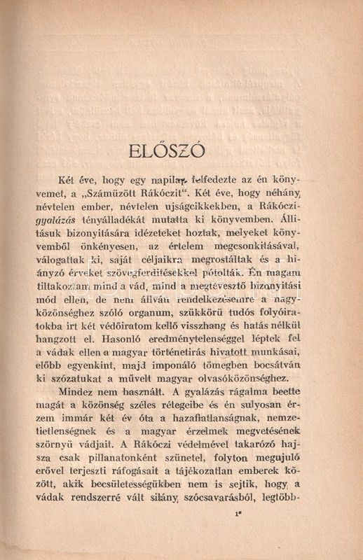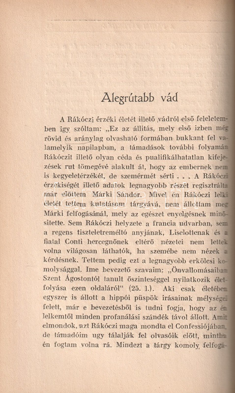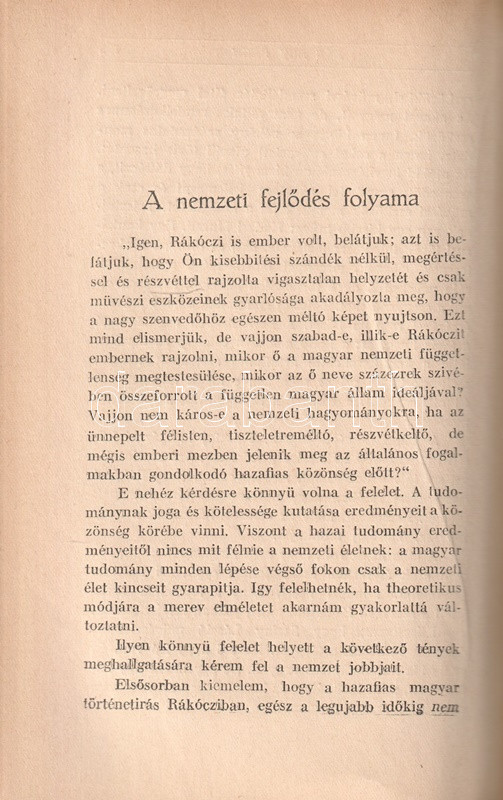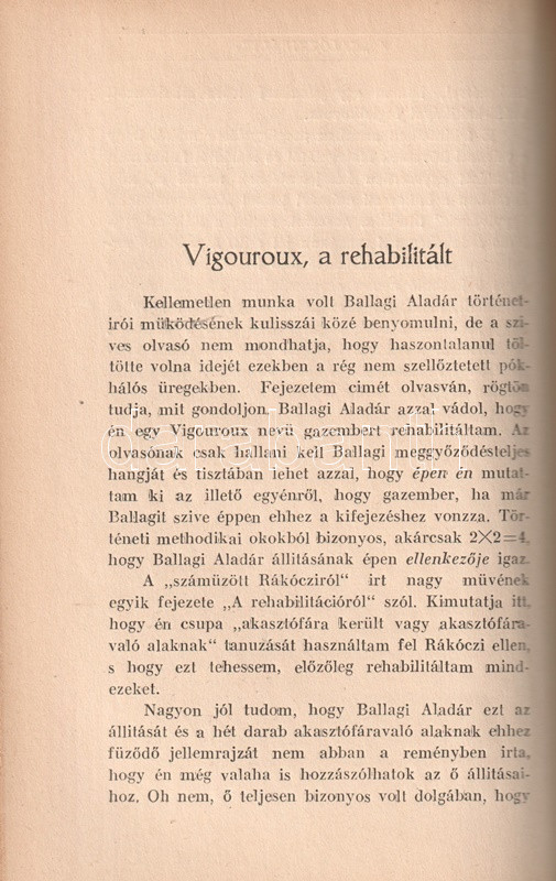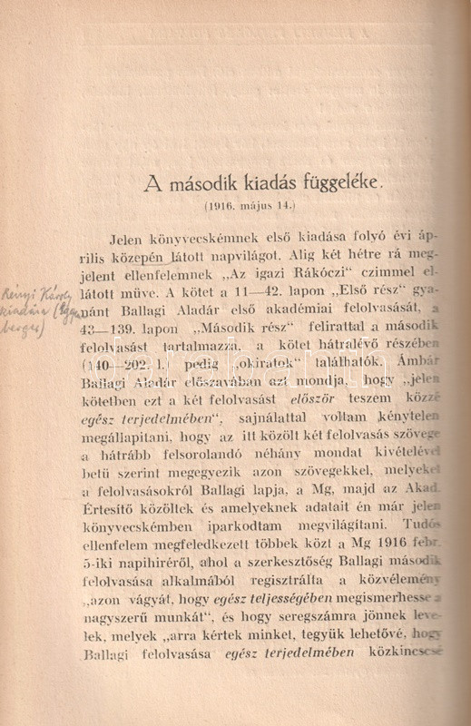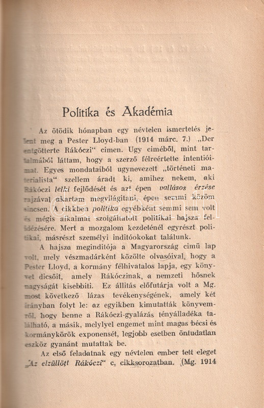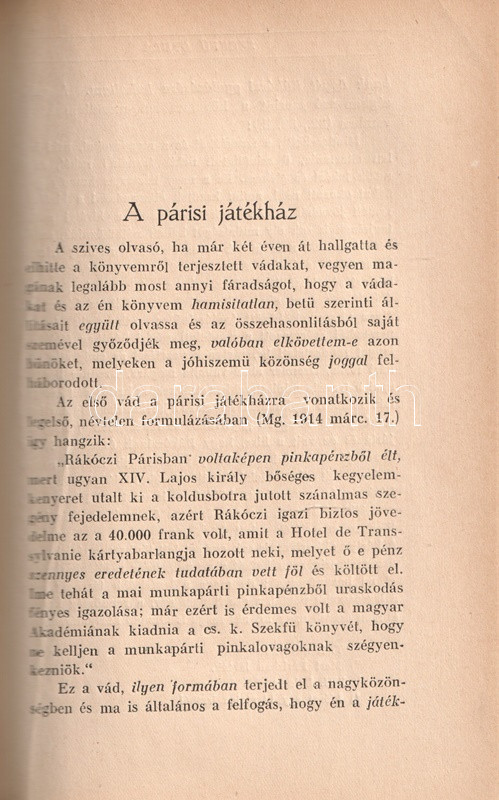 Szekfű Gyula (1883-1955) történész Rákóczi-monográfiája a korban szokatlanul nagy indulatokat kavart. Az 1900-as évek elejére, Thaly Kálmán legendaképző eljárásának köszönhetően Rákóczi fejedelem alakja köré valóságos kultusz szövődött, egyben politikai, sőt tudományos szempontból is kialakult egy elvárásrendszer arra nézvést, hogy az egykori fejedelem alakját miként is lehetséges megidézni, illetve milyen forrásanyagokat lehet felhasználni, és mi számít tabunak. Szekfű Gyula fiatal történészként felkavarta az állóvizet, mikor levéltári kutatások alapján feltárta Rákóczi párizsi megélhetésének gazdasági alapjait. Történészi részről Ballagi Aladár ítélte el a könyvet, nemzetgyalázás címén, a vitához a sajtó is csatlakozott. A körképhez hozzátartozik, hogy Ballagi sok egyéb pozíciója mellett a Kossuth-kultuszt (és egyéb ellenállók kultuszát) ápoló Függetlenségi Párt politikusa volt, Szekfű Gyula pedig egyetemi karrierje mellett osztrák (labanc) levéltári kutatásairól volt közismert. Ballaginak a Szekfű elleni támadása összességében kimondottan politikai ízűnek mondható, a sajtó által hergelt vita pedig a kiinduló Szekfű-munkához méltatlan színvonalú személyeskedésbe torkollt. Kötetünk nem csupán a magyar történetírás történetének fontos dokumentuma, hanem a politikailag motivált tudományos lejárató-kampányok, egyben a kánonviták jelentős példája. Szekfű Gyula védőirata először 1916-ban jelent meg, példányunk a második, bővített kiadásból való.