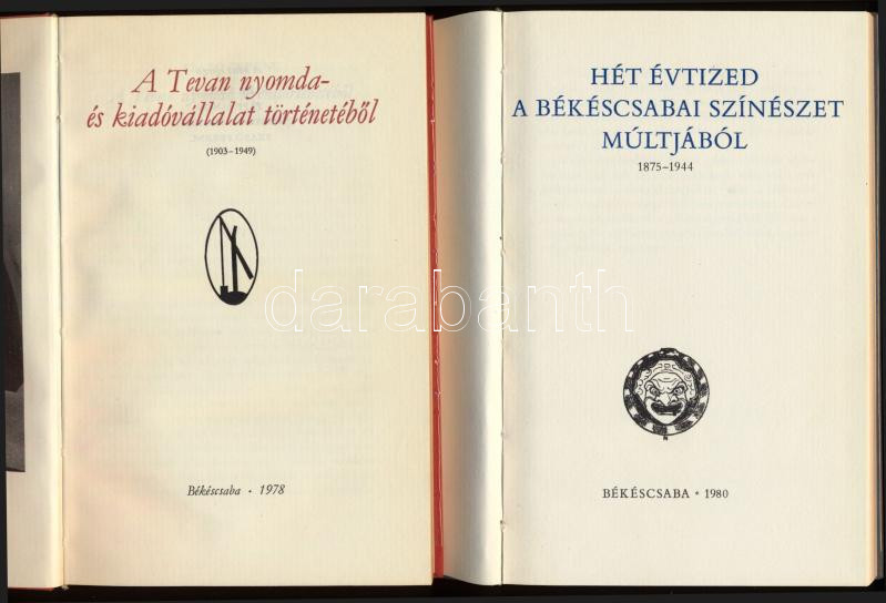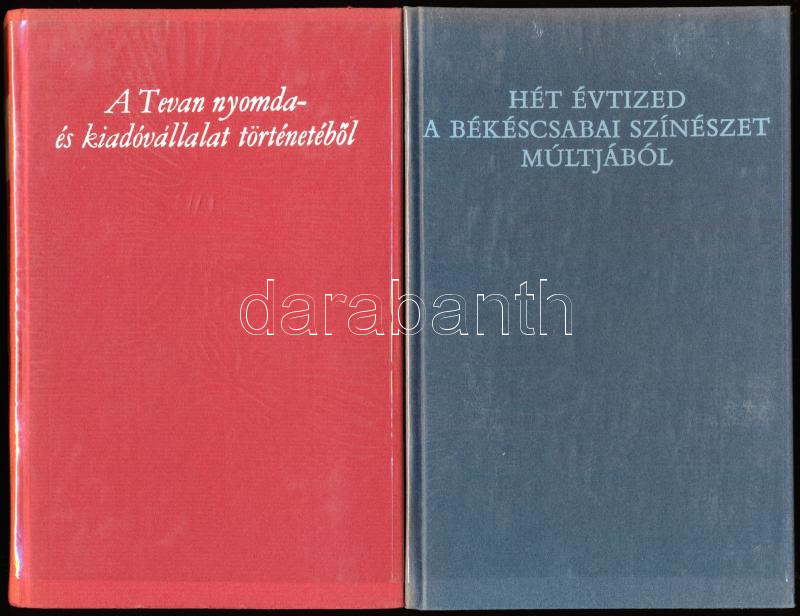 Bibliotheca Bekesiensis 16. és 18. (2 kötet): A Tevan nyomda- és kiadóvállalat történetéből (1903-1949).; Hét évtized a békéscsabai színészet múltjából. Békéscsaba, 1978-1980, Rózsa Ferenc Gimnázium, 161+[3] p.; 76+[4] p. Kiadói egészvászon-kötés, átlátszó műanyag védőborítóban. Számozott (337./400, illetve 465./500) példányok.