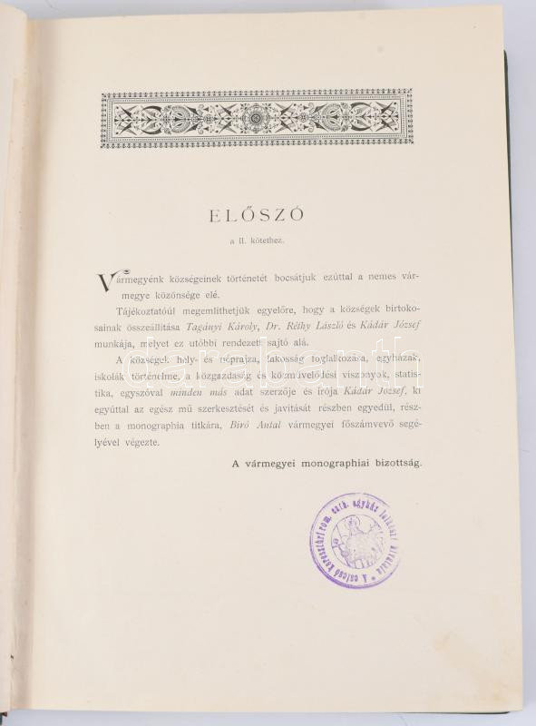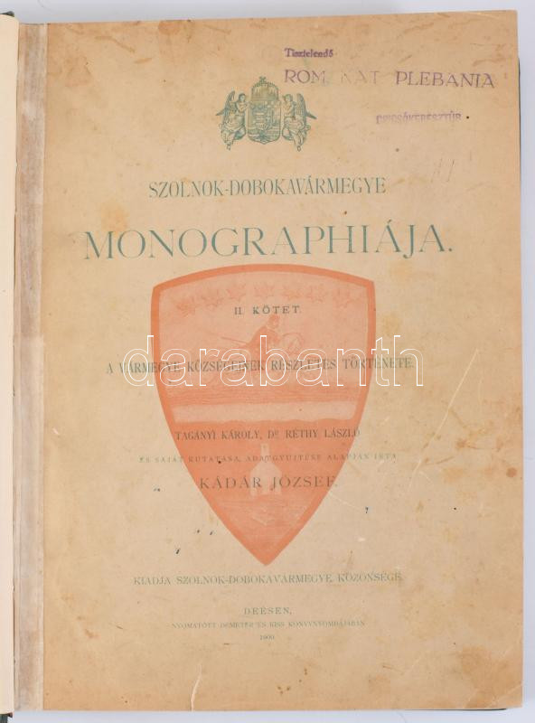 Kádár József - Réthy László - Tagányi Károly: Szolnok-Dobokavármegye monographiája. II. köt. A vármegye községeinek részletes története. Kiadja Szolnok-Dobokavármegye közönsége. Deés [Dés], 1900, Demeter és Kiss-ny., [4]+561+[3] p. Szövegközti képekkel illusztrálva. Átkötött egészvászon-kötésben, néhány kissé foltos lappal, bélyegzőkkel.