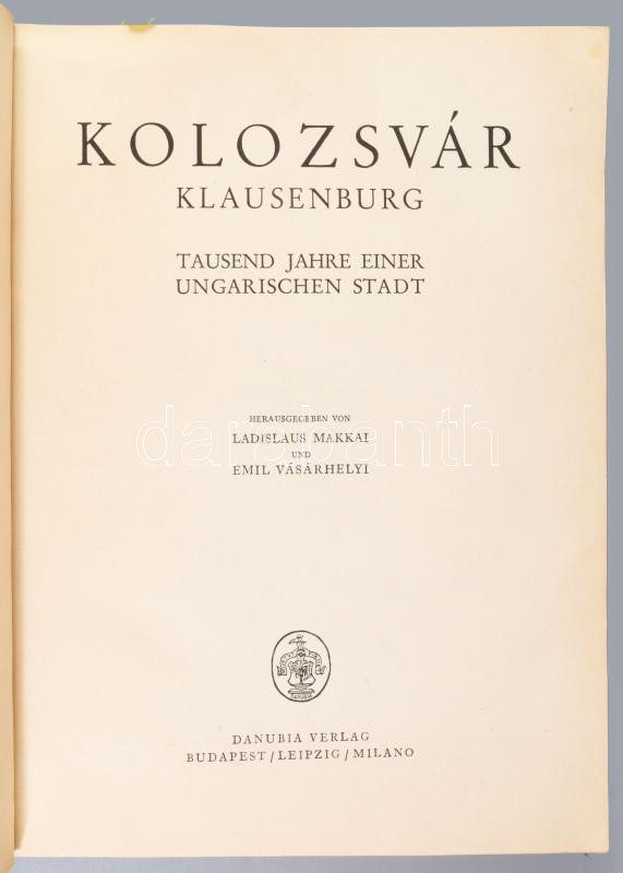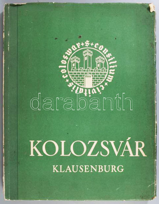 Kolozsvár - Klausenburg. Tausend Jahre einer Ungarischen Stadt. Herausgegeben von Ladislaus Makkai und Emil Vásárhelyi. Bp. -Leipzig-Milano, (1944.), Danubia, (Athenaeum-ny.) 168 + [4] p. Német nyelven. A kolozsvári helytörténeti és társadalomtörténeti tanulmányok után a 105. oldaltól képmelléklet, a 103. oldalon egész oldalas Kolozsvár-térkép. Kiadói papírkötés, foltos, kopott borítóval, a hátsó borítón bejegyzésekkel, a gerincen kis sérüléssel, kissé szakadozott borítószélekkel.