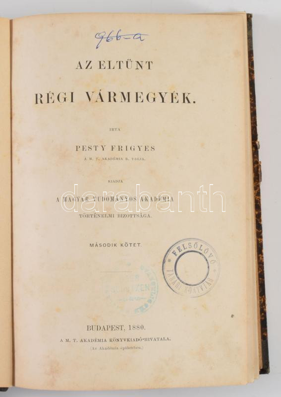 Pesty Frigyes: Az eltűnt régi vármegyék. II. kötet. Bp., 1880, MTA. 509p. Félvászon kötés, néhol foltos lapok, kopottas állapotban.