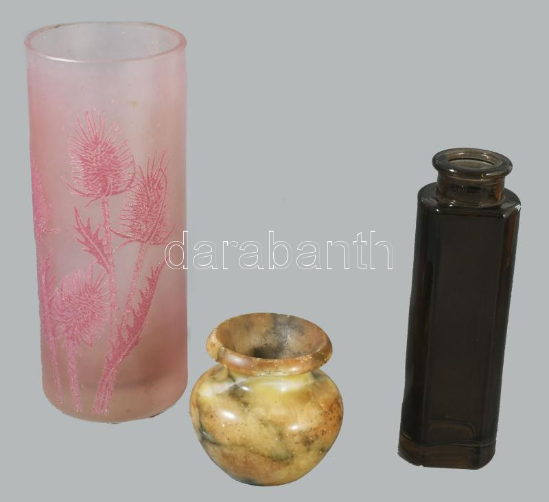 3 darab váza, savmaratott üveg, füstszínű díszüveg, zsírkő, m: 20 cm alatt
