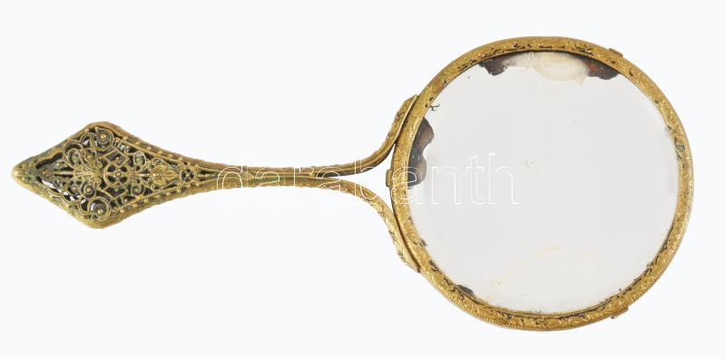 cca 1880 Antik réz kézitükör, sérült üveggel, h: 19 cm