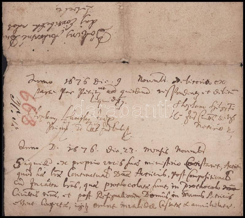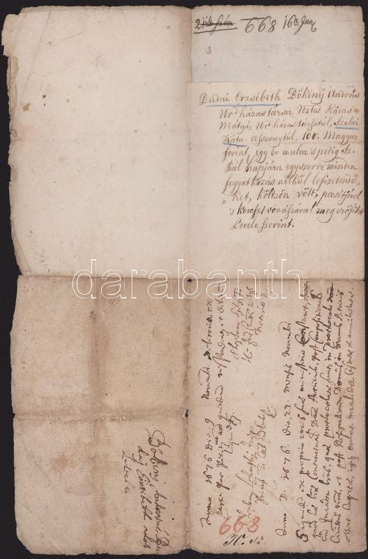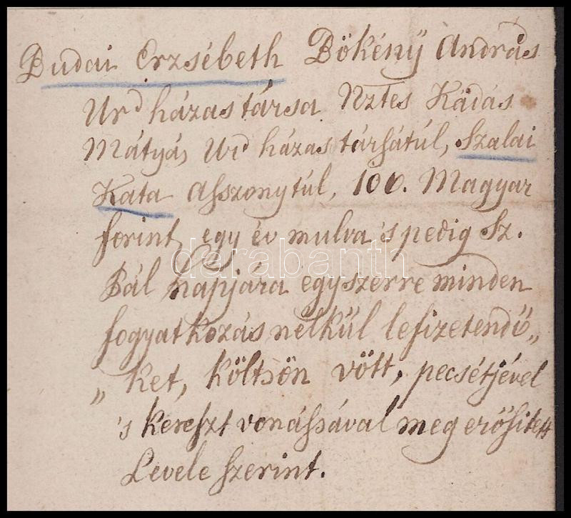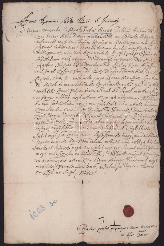 1668 Ungvárban lakó Budai Erzsébet adóslevele 100 forintról Katai Mátyás és Szalai Kata asszonyságnak, melyben saját házát zálogul adja. Gyűrűspecséttel és keze vonásával hitelesített. Magyar nyelven