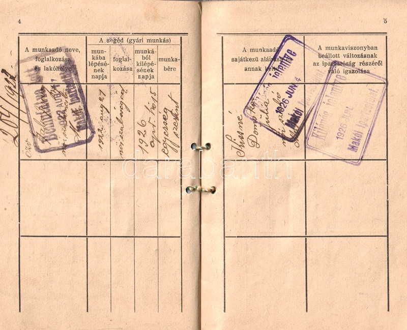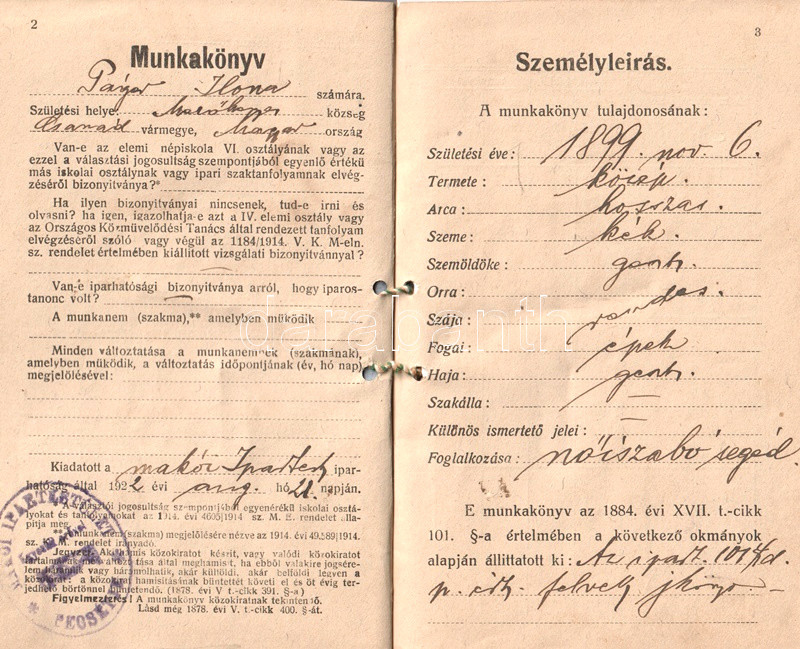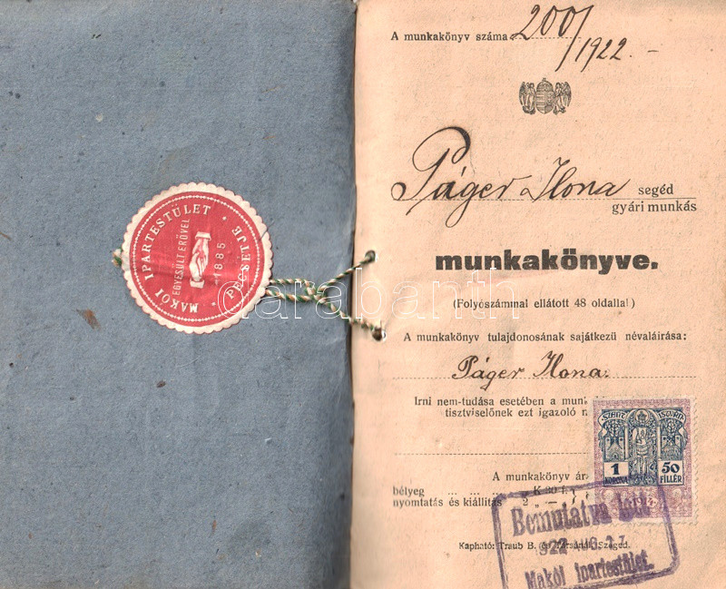 Páger Ilona nőiszabó-segéd munkakönyve, a Makói Ipartestület bélyegzőivel és pecsétjével, kézzel kitöltve, címlapján 1 korona 50 fillér értékű illetékbélyeggel. (1922-1926).