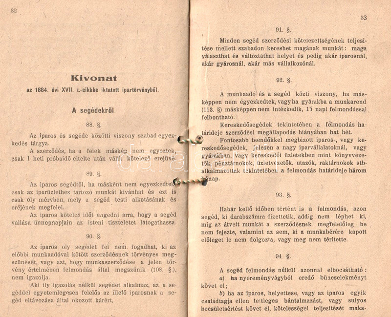 Szegedi nyomású ipartörténeti aprónyomtatványunk az iparsegédek és gyári munkások munkaviszonyának dokumentálására szolgál. Az 1899-ben született mezőhegyesi Páger Ilona nőiszabó-segédet iparostanonc vizsga nélkül vette nyilvántartásba felettes hatósága, a Makói Ipartestület. Személyleírása mellett első két munkáltatóját ismerhetjük meg a dokumentumból. Özvegy Szabó Ferenc makói szabómesternél négy évet töltött, majd a szintén makói Kissné Domokos Júlia szabómester vette alkalmazásba. A két munkahely között Páger Ilona két hónapig nem volt alkalmazásban, második munkahelyén (ismeretlen okokból) mindössze fél hónapot töltött. További sorsáról nincs tudomásunk. A címlapon Páger Ilona saját kezű aláírása, a belső borítón a Makói Ipartestület pecsétje.