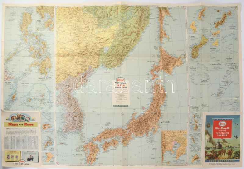 Esso War Map - The Pacific Theater / Japán és a csendes-óceáni hadszíntér, II. világháborús térkép, kétoldalas, kisebb szakadásokkal, 57,5x83,5 cm