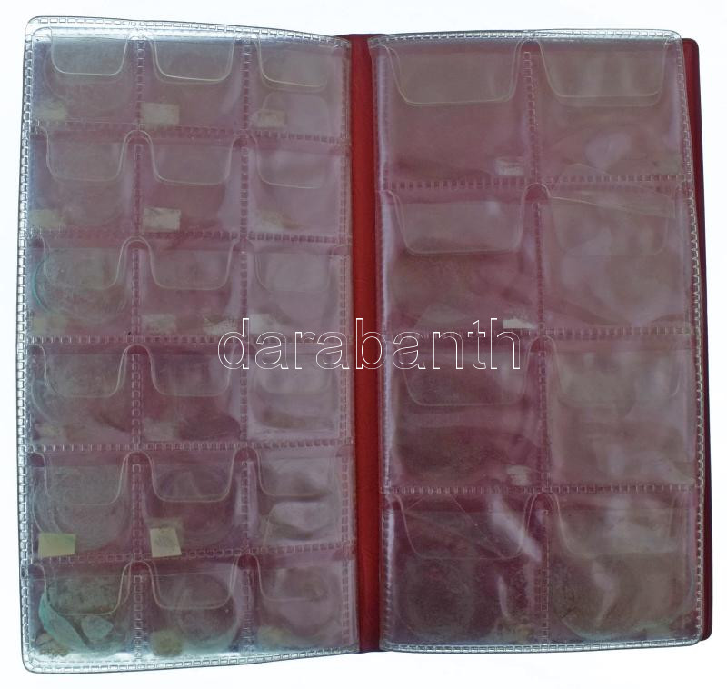 Kisalakú, műbőr érmeberakó, négy lapos, összesen 52 férőhellyel, használt állapotban