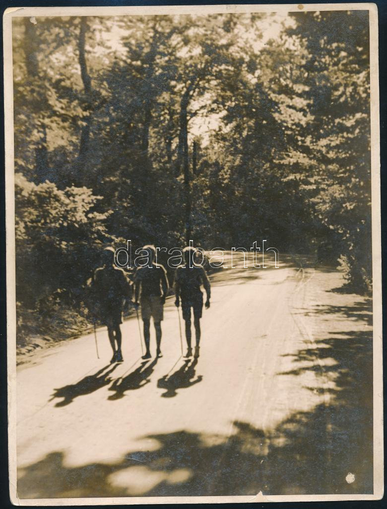 cca 1930 Túrázó gyerekek egy erdei úton, jelzés nélküli fotó, felületi sérülésekkel, 24×18 cm