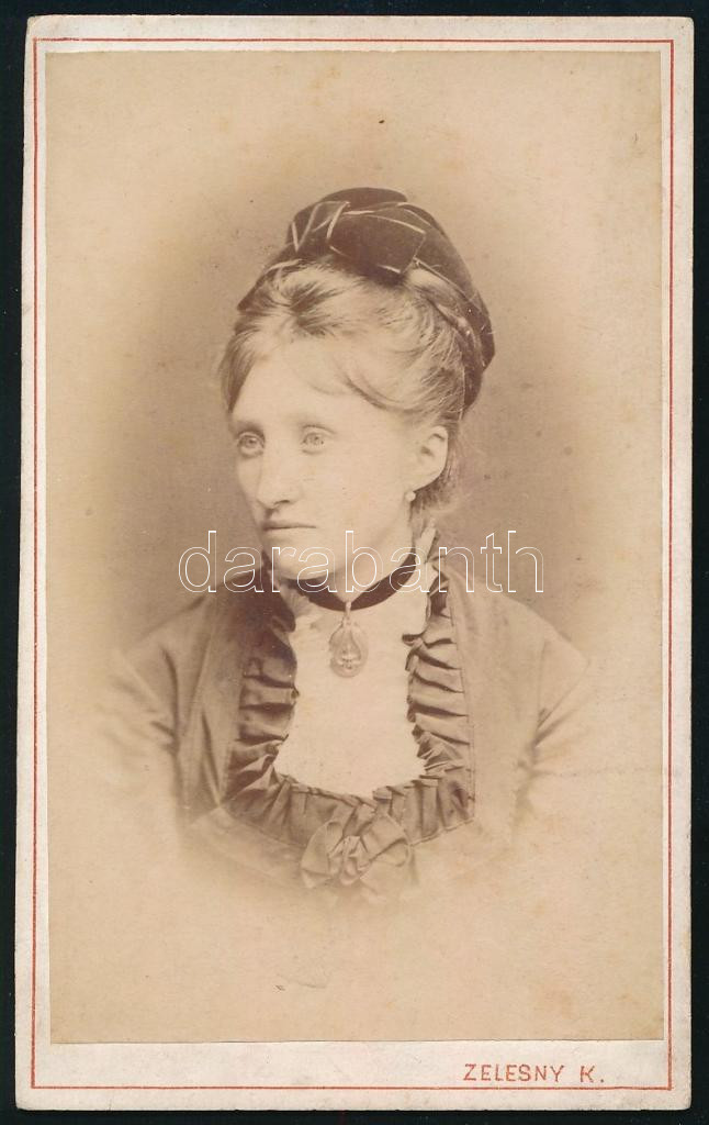 cca 1880 Mihálkovics Tivadarné Ráth Irén, Mihálkovics Tivadar (1848-1927) közjegyző, az Országos Csónakázó Szövetség alapítója és első elnöke, a balatoni vitorlásélet egyik megalapozója, az alsóörsi üdülőtelep és strand létrehozója feleségének portréja, vizitkártya Zelesny Károly pécsi műterméből, a hátoldalon feliratozva, 10x6 cm
