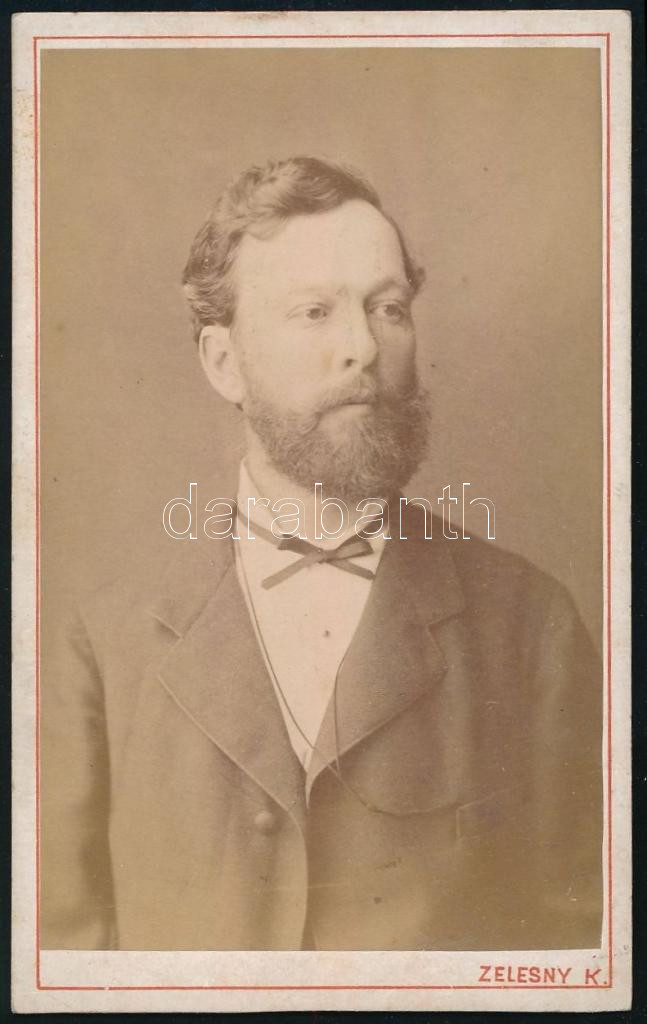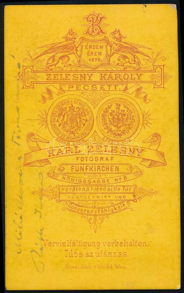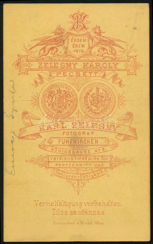 cca 1880 bánhalmi Emresz Gyula, az Országos Magyar Vadászati Védegylet tagja (neve megtalálható a Vadász-Lap 1886. január 15-i számában közzétett tagnévsorban), bánhalmi Emresz Károly (1814-1891) főorvos fiának portréja, vizitkártya Zelesny Károly pécsi műterméből, a hátoldalon feliratozva, 10x6 cm