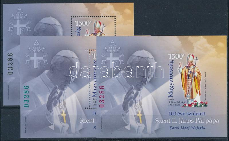 2020 100 éve született II. János Pál pápa fogazott, túlfogazott és vágott blokk azonos 03286 sorszámmal (24.500)