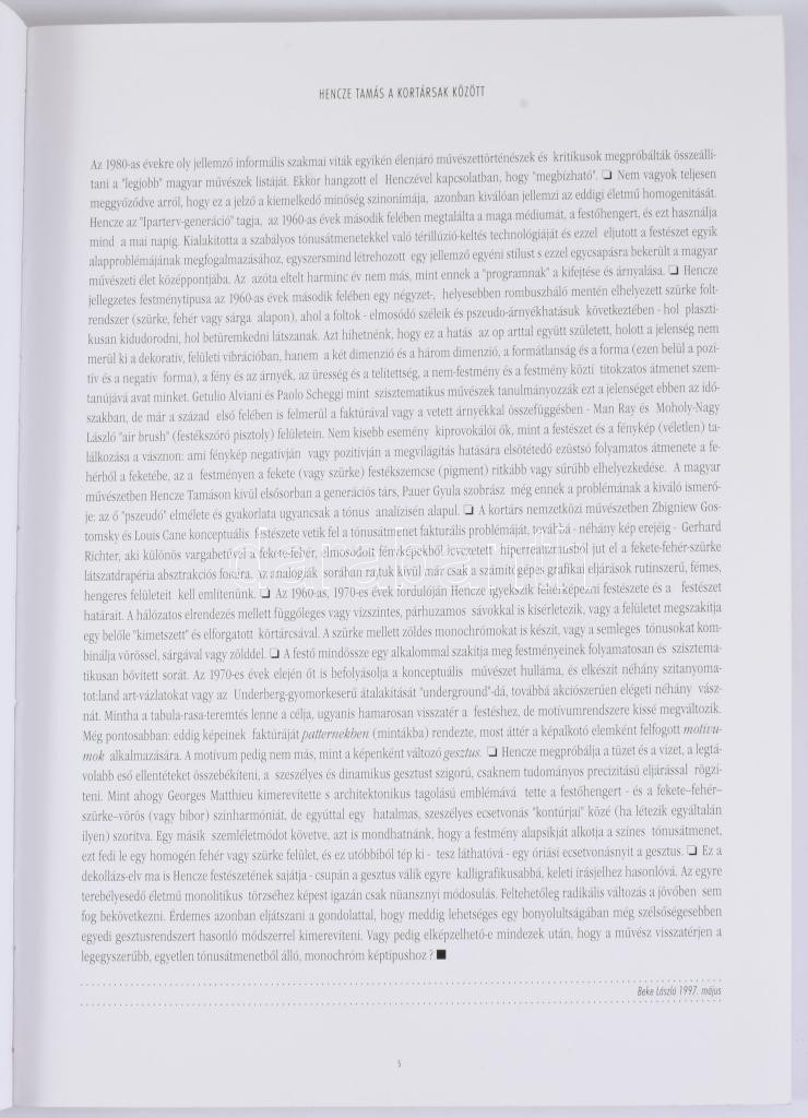 Hencze Tamás: Festmények / Paintings. 1963-1997. Hencze Tamás festőművész retrospektív kiállítása. Szerk.: Kozák Csaba, Pócs Péter, Sík Csaba. Bp., 1997, Műcsarnok. Gazdag képanyaggal illusztrálva. Magyar és angol nyelven. Kiadói papírkötés, a borítón benyomódással, gyűrődéssel.
