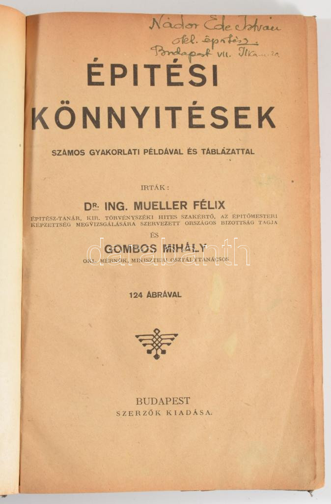 Dr. Ing. Mueller Félix - Gombos Mihály: Építési könnyítések számos gyakorlati példával és táblázattal. Bp., Szerzők. 203p. Félvászon kötés, kopottas állapotban.