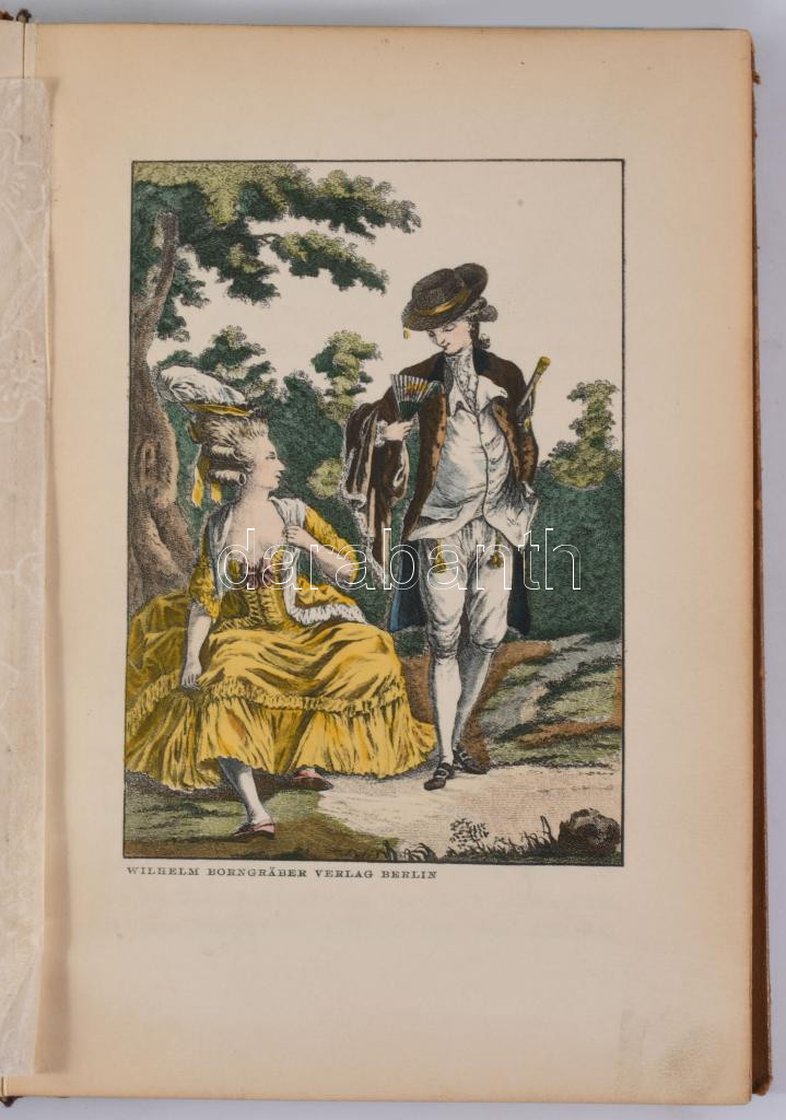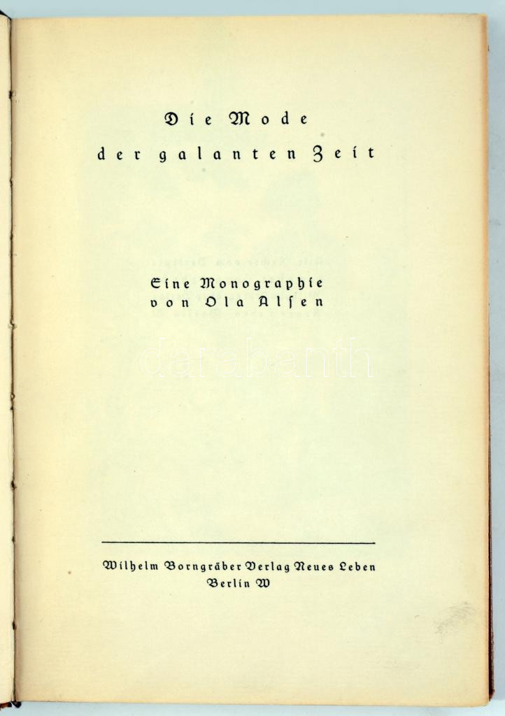 Ola Alsen: Die Mode der galanten Zeit. Eine Monographie von - -. Berlin,én.,Wilhelm Borngräber, 175+6 p.+6 t. Német nyelven. Korabeli aranyozott egészbőr-kötés, festett felső lapélekkel, kopott borítóval.
