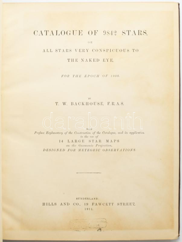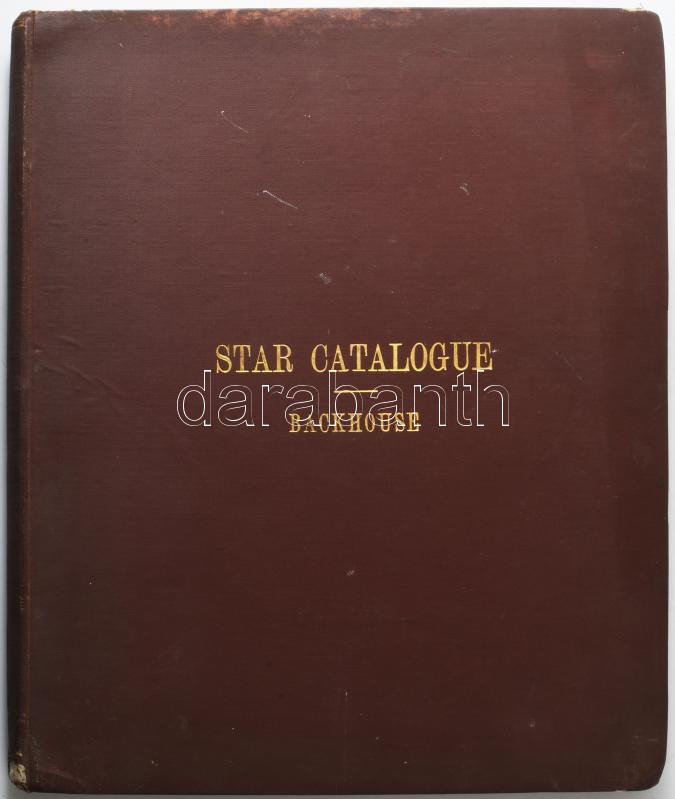 T. T. Backhouse: Catalogue of 9842 stars, or, All stars very conspicuous to the naked eye, for the epoch of 1900. Sunderland, 1911, Hills and Co., XX+186 p. Átkötött egészvászon-kötés, kissé kopott, kissé foltos borítóval.