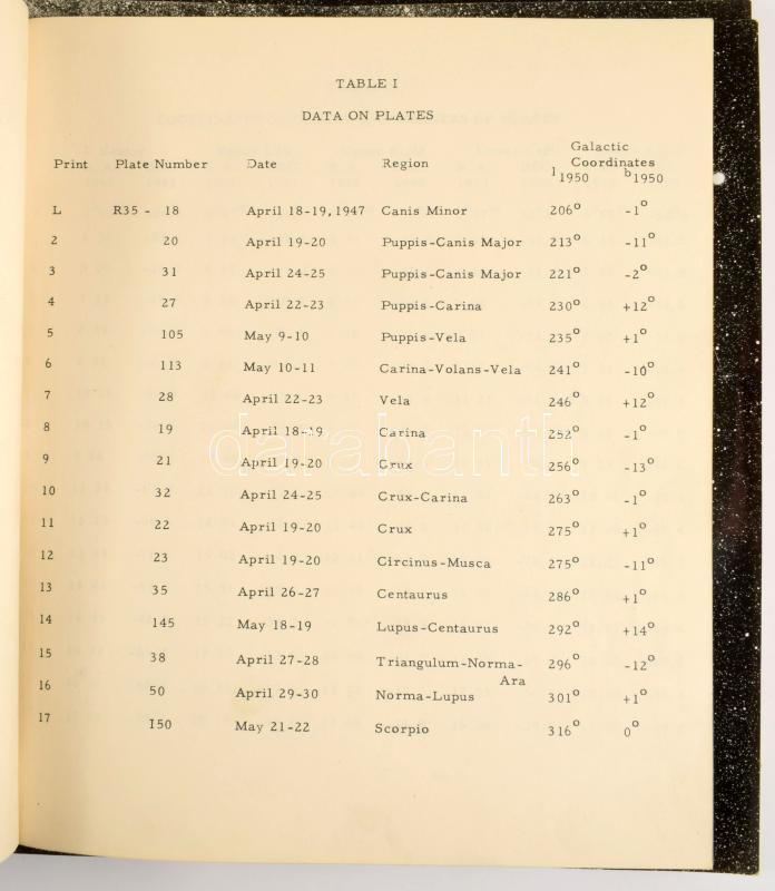 1952 [Francis J. Heyden]: Photographic atlas of the southern Milky Way (gal. long. 210 - 320.) [Washington, D.C.], 1952, Georgetown College Observatory : National Geographic Society, 5 sztl. lev. + 17 (fekete-fehér fotók, 26x25 cm.) t. Angol nyelven. + Benne Űrkutatás gyufacímkeív, valamint 2 kisebb fotó, és Holdkőzet prospektus. Kiadói sérült papírmappa, a papírmappán bejegyzésekkel, egy-két fotó sarkán kisebb törésnyom. Papírmappa: 27x27 cm