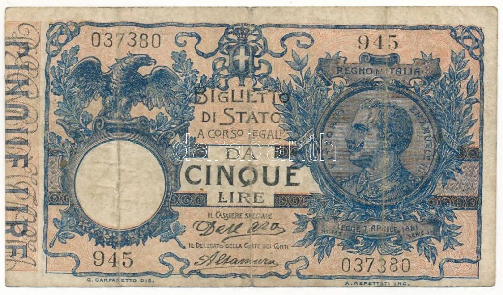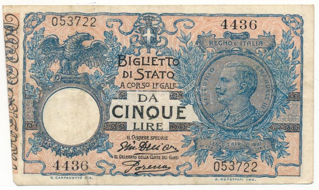 Italy 1918. 5 Lire "4436 053722" C:F fine paper