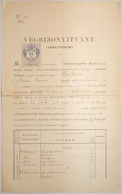 Leírás: 1892 Végbizonyítvány Kiss Gyula izraelita orvoshallgató részére Eötvös Lóránd és Fodor József aláírásával