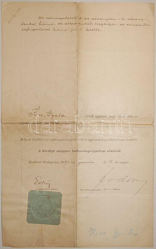 1892 Végbizonyítvány Kiss Gyula izraelita orvoshallgató részére Eötvös... https://www.darabanth.com/hu/53-Gyorsarveres/53.0/Festmeny-mutargy-papirregiseg-egyeb/Alairas-Signatures~210/1892-Vegbizonyitvany-Kiss-Gyula-izraelita-orvoshallgato-reszere-Eotvos-Lorand-es-Fodor-JC3~II104026