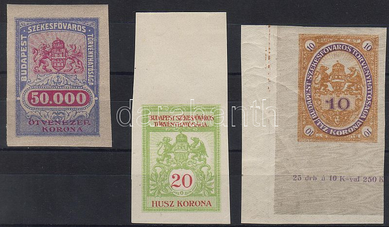 Leírás: Budapest városi okménybélyegek 3 fogazatlan fázisnyomat