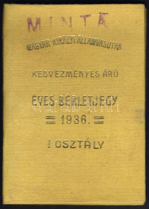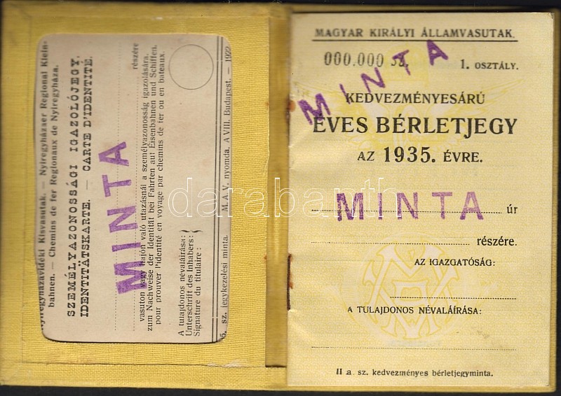 1936. Magyar kir. Államvasutak kedvezményes I.oszt. éves bérletjegy "0... https://www.darabanth.com/hu/53-Gyorsarveres/53.0/Festmeny-mutargy-papirregiseg-egyeb/Okmanyok-Documents~209/1936-Magyar-kir-Allamvasutak-kedvezmenyes-Ioszt-eves-berletjegy-000-as-Minta-R~II104022