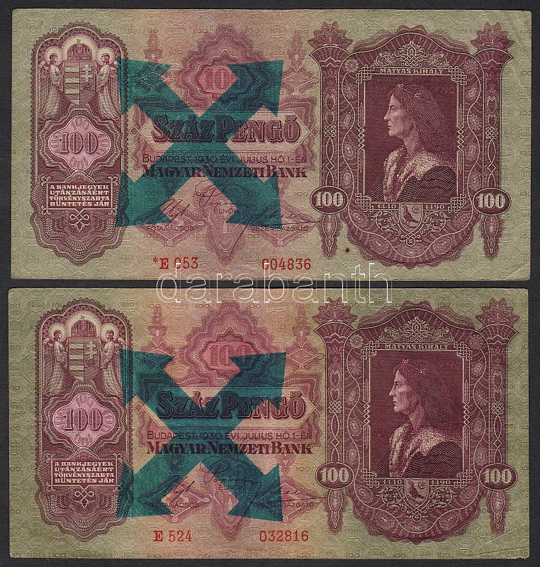 1930. 100P "Nyilaskeresztes" fny-sal (2x) T:II https://www.darabanth.com/hu/53-Gyorsarveres/53.0/Numizmatika/NUMIZMATIKA-NUMISMATICS~217/1930-100P-Nyilaskeresztes-fny-sal-2x-TII~II103751