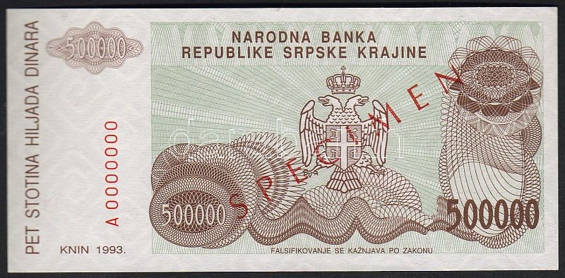 Leírás: Horvátország/Krajina Szerb Köztársaság 1993. 500.000D "Specimen 000" T:I