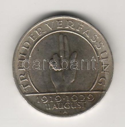 Leírás: Német Birodalom/Weimar-i Köztársaság 1929A 3RM Ag "Alkotmány" T:2 kis ph