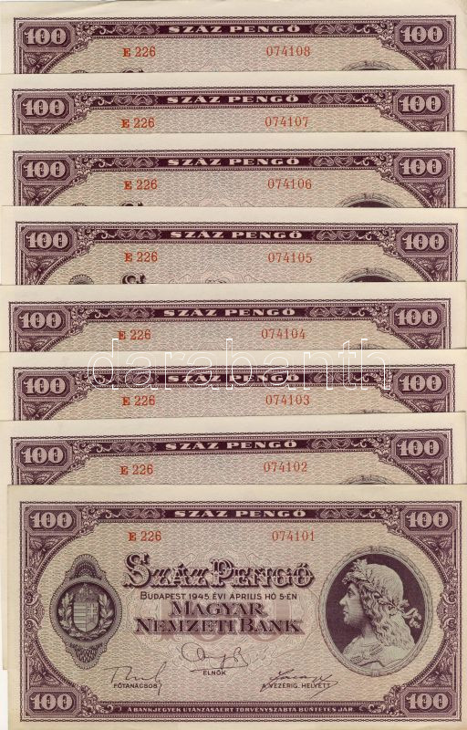 1945. 100P 8db+8db+6db egymásutáni sorszámokkal, összesen 22db T:I,I- https://www.darabanth.com/hu/62-Gyorsarveres/62.0/Numizmatika/Magyar-es-kulfoldi-bankjegyek~187/1945-100P-8dbplus8dbplus6db-egymasutani-sorszamokkal-osszesen-22db-TI-I-~II123309