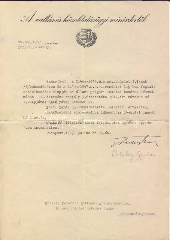 1947 Kinevezési okmány Ortutay Gyula vallás és közoktatásügyi miniszte... https://www.darabanth.com/hu/63-Gyorsarveres/63.0/Festmeny-mutargy-papirregiseg-egyeb/Alairas-Signatures~277/1947-Kinevezesi-okmany-Ortutay-Gyula-vallas-es-kozoktatasugyi-miniszter-aluairasaval~II124917