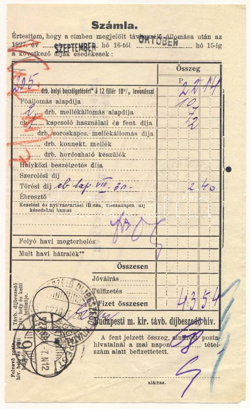 Leírás: 1927 Telefonszámla