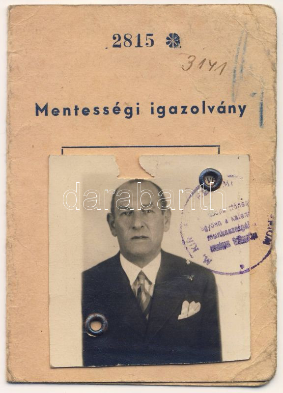 1944 Fényképes mentességi igazolvány https://www.darabanth.com/hu/63-Gyorsarveres/63.0/Festmeny-mutargy-papirregiseg-egyeb/Okmanyok-Documents~276/1944-Fenykepes-mentessegi-igazolvany~II124908