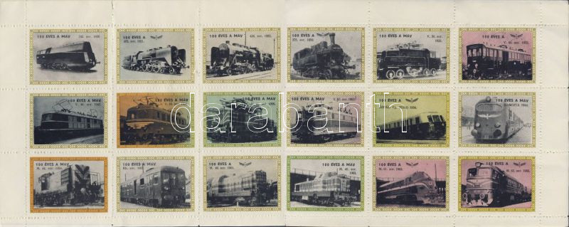 Leírás: 100 éves a MÁV, mozdonyokat ábrázoló 18db-os levélzáró kisív