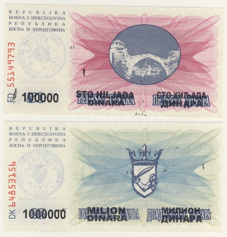 Leírás: Bosznia 1992. 25D, 50D "Tuzlanska Regija 100.000D ill. 1000.000D felülbélyegzés T:I
