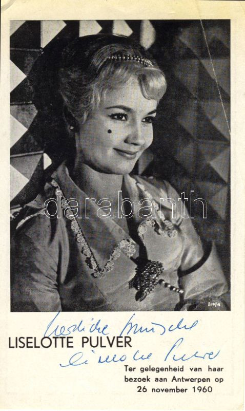 Liselotte Pulver aláírása fényképen https://www.darabanth.com/hu/65-Gyorsarveres/65.0/Festmeny-mutargy-papirregiseg-egyeb/Alairas-Signatures~236/Liselotte-Pulver-alairasa-fenykepen~II127441