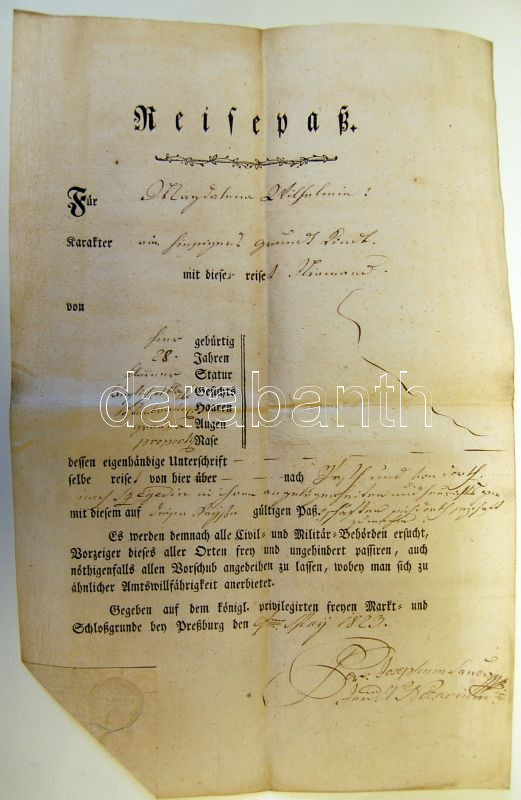 1823 Német nyelvű útlevél Pozsony https://www.darabanth.com/hu/65-Gyorsarveres/65.0/Festmeny-mutargy-papirregiseg-egyeb/Okmany-Documents~235/1823-Nemet-nyelvu-utlevel-Pozsony~II124904