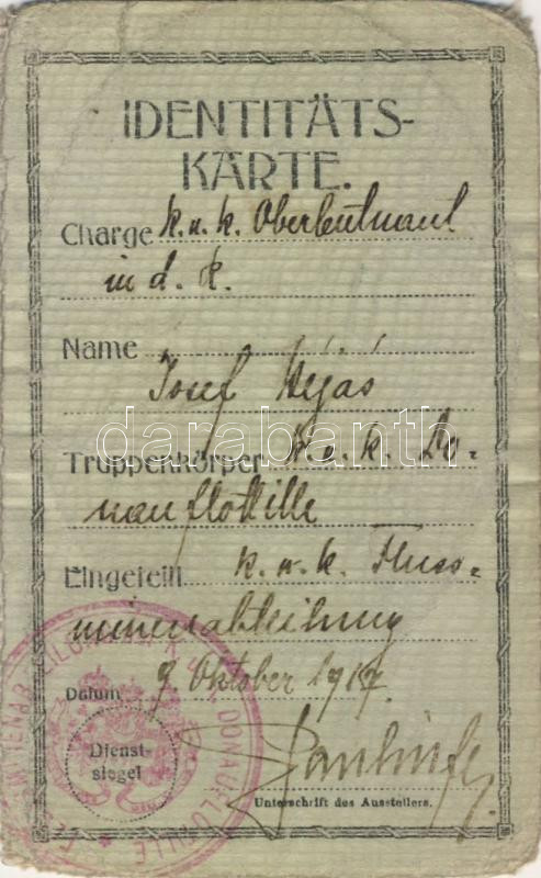 1917 Dunai folyami flottila igazolvány "FLUSSMINEN ABTEILUNG DER KUK D... https://www.darabanth.com/hu/65-Gyorsarveres/65.0/Festmeny-mutargy-papirregiseg-egyeb/Okmany-Documents~235/1917-Dunai-folyami-flottila-igazolvany-FLUSSMINEN-ABTEILUNG-DER-KUK-DONAUFLOTILLE~II127667