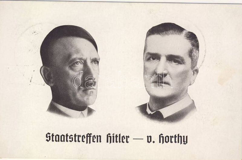 Horthy és Hitler alkalmi bélyegzéssel https://www.darabanth.com/hu/65-Gyorsarveres/65.0/Kepeslapok/Motivum-kepeslapok-Thematic-postcards~244/Horthy-es-Hitler-alkalmi-belyegzessel~II125348