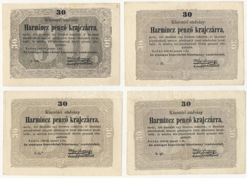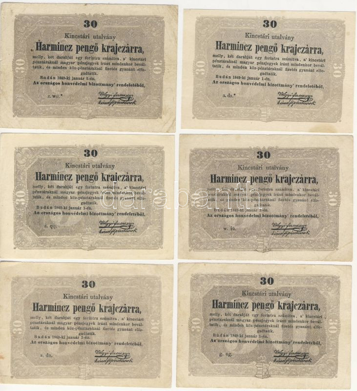 Leírás: 1848. 30kr "Kossuth bankó" előlap durva elmosódott festékelfolyásokkal tarkított nyomat T:I + 9db T:II+,II bennük lemezhibák, méretváltozatok, színvariánsok