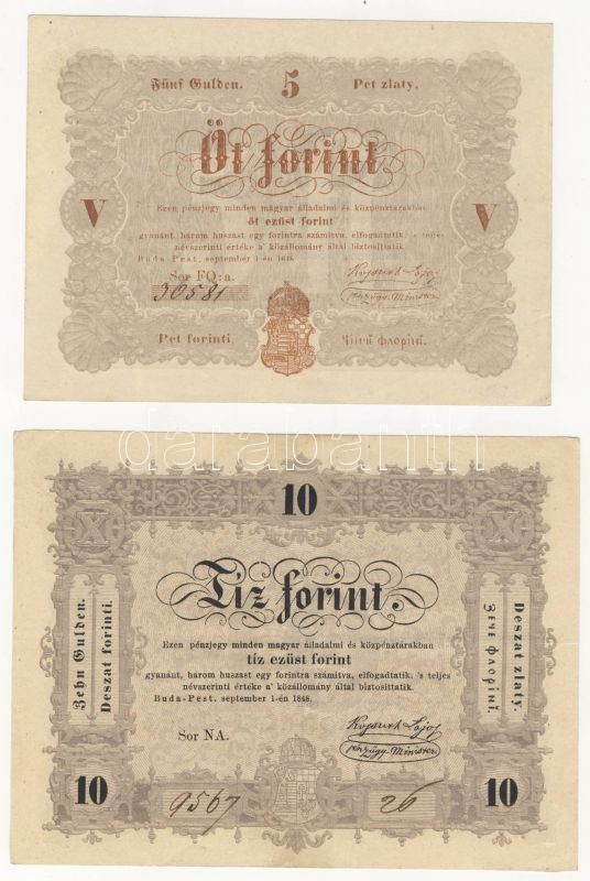 Leírás: 1848-49. "Kossuth bankók" 15kr hátoldal ferdén nyomva! T:I-, 30kr "*"-gal T:I-, 1Ft T:restaurált, 2Ft T:I, 2P Ft "fekete" T:II+ csak egyszer hajtott, 5Ft barna T:I, 10Ft "1848" alatt halvány gépszínátnyomat T:II, 100Ft T:kicsit restaurálva