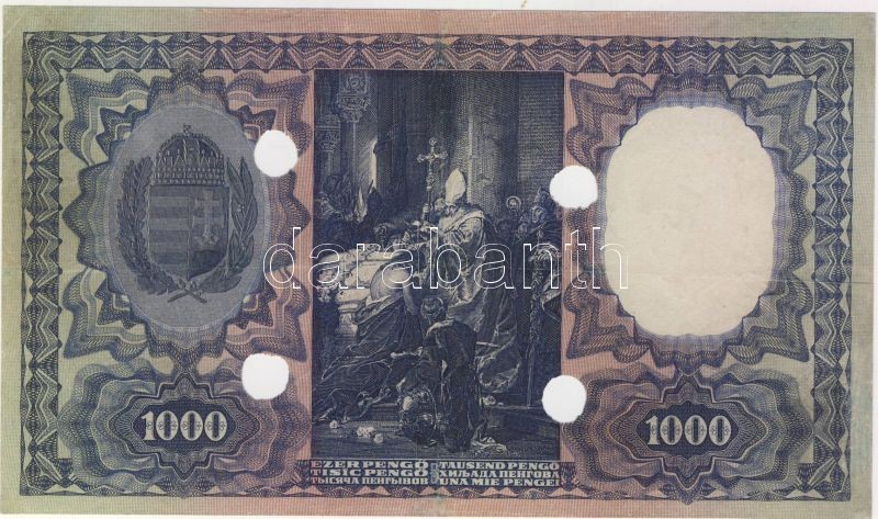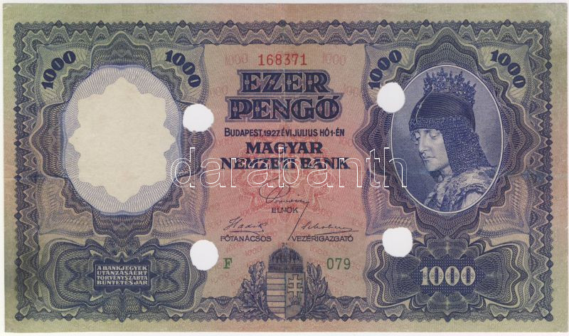Leírás: 1927. 1000P 4 lyukkal (érvénytelenített) T:kis mértékben restaurált, alsó szél egyenetlenül vágva RRR!!!