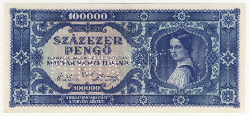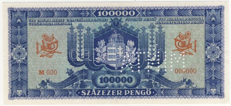 Leírás: 1945. 100.000P "kék" minta perforációval "000"-ás T:kissé restaurálva, egyébként hajtott