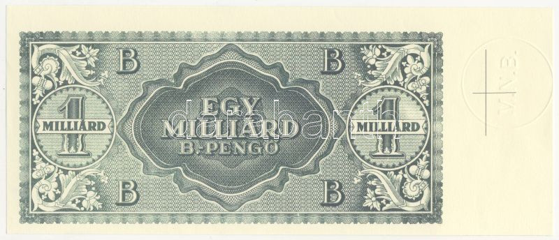 Leírás: 1946. 1000.000.000B.-pengő "zöld" jobb felső ívszéllel "M.K.B" szárazbélyegzővel, illesztőkereszttel, csak hátlapi nyomat T:I