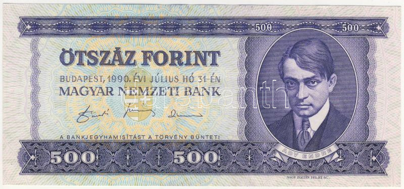 1990. 500Ft hátlapon lila festékfoltok T:I https://www.darabanth.com/hu/65-Gyorsarveres/65.0/Numizmatika/NUMIZMATIKA-NUMISMATICS~246/1990-500Ft-hatlapon-lila-festekfoltok-TI~II127744