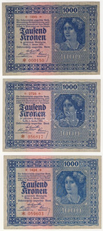 Ausztria/Osztrák-Magyar Bank 1922. 1000K (3x) T:I,I- https://www.darabanth.com/hu/65-Gyorsarveres/65.0/Numizmatika/NUMIZMATIKA-NUMISMATICS~246/AusztriaOsztrak-Magyar-Bank-1922-1000K-3x-TI-I-~II127841