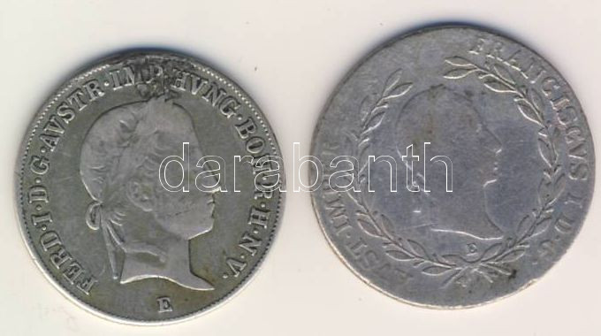 Ausztria/magyar verdejel 1830E 20Kr Ag T:4+ + 1842E 20Kr Ag T:3 fny https://www.darabanth.com/hu/65-Gyorsarveres/65.0/Numizmatika/NUMIZMATIKA-NUMISMATICS~246/Ausztriamagyar-verdejel-1830E-20Kr-Ag-T4plus-plus-1842E-20Kr-Ag-T3-fny~II127304